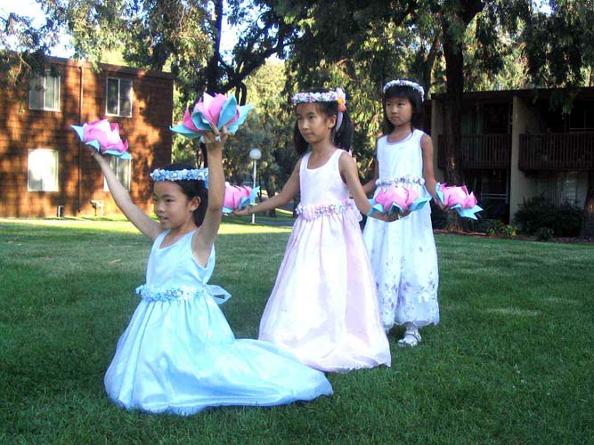 下午五点半仪式开始,学生们表演的第一个节目“莲花舞”吸引了不少过往行人的目光。孩子们手执莲花、彩带,伴着《莲花颂》的乐曲翩翩起舞,动作舒缓优雅,表情宁静祥和,逼真的传达了“出淤泥而不染、濯清涟而不妖”的韵味。