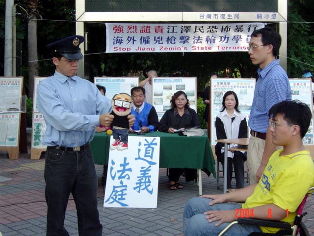 记者会是以审江行动剧的演出说明了澳洲法轮功学员在南非遭枪击的经过及分析枪击疑点,现场有许多观众围观,并有多位民意代表出席,包括钱林慧君立委、洪玉凤议员、王家贞议员、李俊义立委秘书、唐碧娥立委秘书,他们一致表达了对江氏集团暴行的谴责及支持人权正义的立场。
