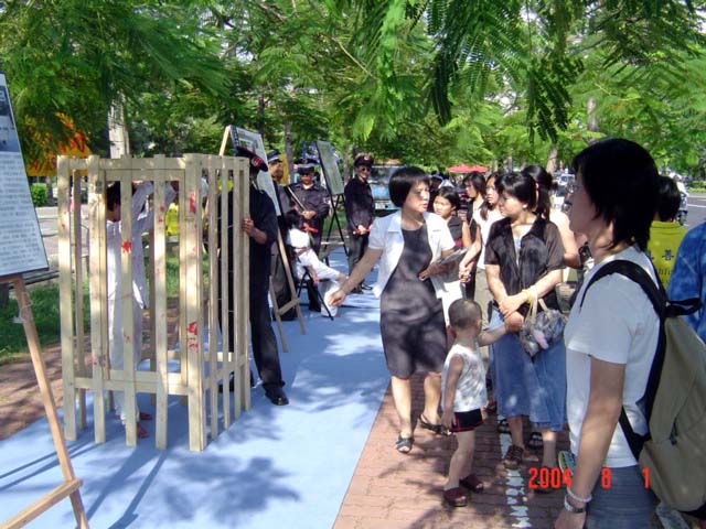 一位在关渡基督学院读书的女孩说:「太恐怖了!怎么这么残忍呢?」她说:曾听过法轮功受迫害的事,但没想到这么严重。还有一位曾到大陆念书的女孩说:「江氏集团电视台全都是说法轮功不好的新闻,今天一看才知道都是假的。」现场还有情侣档、母子档、老人等不同年龄的民众驻足细看。