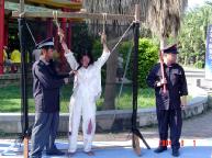 由于8月1日是周日,公园有许多散步、运动的民众,还有过往的路人、机车骑士,很多都被真人模拟的酷刑演示震惊了。