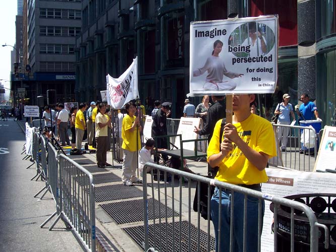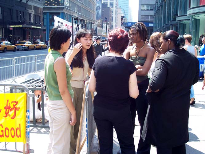 一位台湾来的学员说,她去了三家布店,每家布店的人都知道法轮大法学员。有的学员身穿写有法轮功字样的黄T恤衫,路上碰到的美国人跟他说,在炮台公园(Battery Park)见到好多法轮功学员。你们法轮功到处都是,有上千人(thousands of thousands Falun Gong practitioners on the street)。