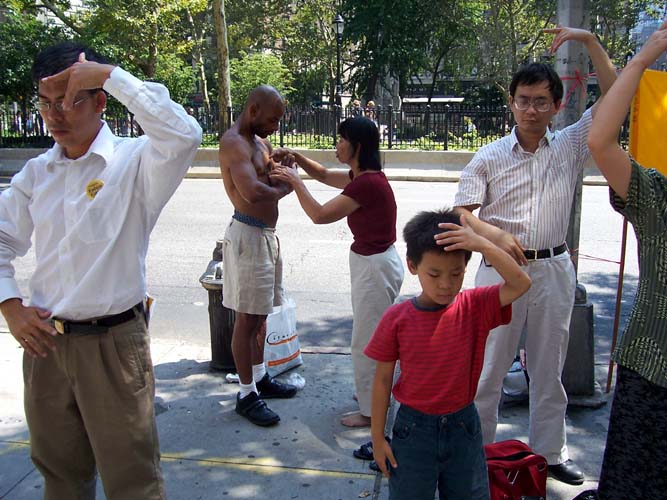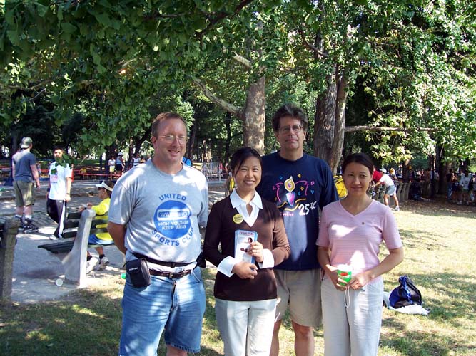 星期天,在纽约的中央公园,我们遇到两名男士,其中一位男士说他们在威斯康星州 的电视节目上,看到一位从中国来的教师在电视上介绍她在中国受到的酷刑迫害,这位女教师还在电视上教法轮功的动功,这位男士就跟着动作学了起来,他说他当时就感到了很强的能量。他对法轮功有了一定的了解。这次他又见到法轮功学员,他主动邀请与学员们合影。他们表示回去后就会开始炼功。