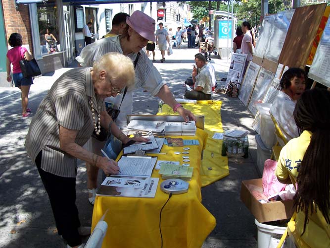 一位驻在纽约皇后区的女士看到学员们举办的酷刑展,就问学员为什么中国政府要镇压法轮功,当学员告诉她中国有很多人炼功觉得法轮功很好,就有越来越多的人炼,当时的中国领导人江××出于妒嫉开始镇压,导致一千多人被酷刑折磨致死。这位女士听了后跟学员要了更多的资料,说要在地铁上好好阅读。