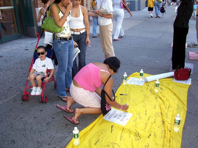 有位年轻的女士在地上的黄布上签了自己的名字后,又签了几个人的名字。当被问到原因时,她说,我不光要签上自己的名字,我也要把我家里所有人的名字都签上,因为我不希望迫害发生在他们身上。