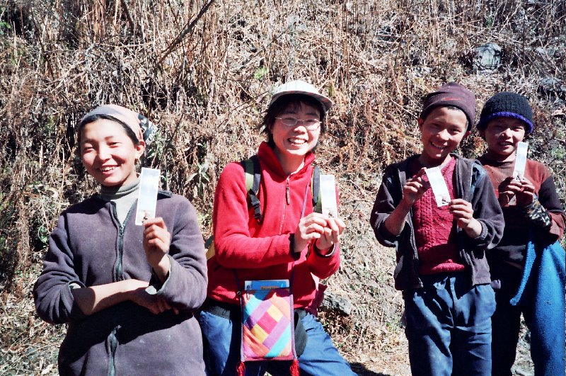 在开始登山的途中,我们遇到几位尼泊尔少女和小朋友们,于是拿了几张大法简介图片向他们介绍法轮大法,并教他们用中文说“法轮大法好”,“真善忍好”,他们很开心的跟着学,由于他们很喜欢,所以希望我能多念几次,好让他们能记下来。看着他们开心而努力的念着“法─轮─大─法─好─”,“真─善─忍─好”心里真的好为他们感到高兴!真希望这里善良的居民们都有机缘学法轮功,了解大法的美好。虽然只是短暂的相逢,却感觉到好像在很久之前就认识了他们,与他们相约好了,在这个时候来告诉他们“法轮大法好”,“真善忍好”。