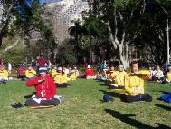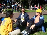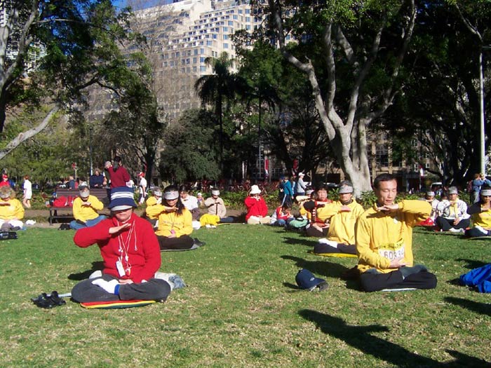法轮功学员飞利浦-罗(Phillip Law)和未婚妻谢焱参加了清晨炼功及步行活动。Phillip在采访中表示,“能在清新的空气下自由的炼功,非常的舒服。可是,同时想到因江氏邪恶集团对法轮功的镇压,国内的同修失去了公开炼功的合法权益我又非常的难过。我希望不久的将来,所有在中国大陆的法轮功修炼者都能自由的、无忧无虑的公开炼功。” 谢焱来自广州,曾被非法判处劳教2年,关押于臭名昭著的广州槎头劳教所。在未婚夫和澳洲政府的强烈呼吁和帮助下,谢焱于2004年7月31日从中国被成功营救出来到澳洲与Phillip团聚。谢焱感慨的说,“今天早上炼功,我感到非常的激动。自1999年7.20以后,这是我第一次在大型的公开场合与同修一起炼功来展示大法的祥和与美好。我很记挂大陆遭受迫害的同修,他们失去了这样的环境与机会。我呼吁江集团对法轮功学员的迫害会立即结束,这场迫害是本就不该发生的。”