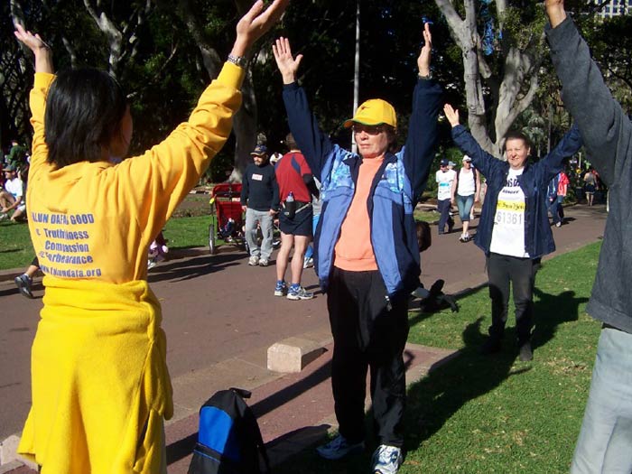 清晨7点左右,数十名法轮功学员于活动起点的海德公园進行大炼功和发正念。祥和的炼功场面吸引着熙熙攘攘前来参加跑步步行的人群。很多人静静的看完五套功法,拍照、主动和学员攀谈并询问炼功点。