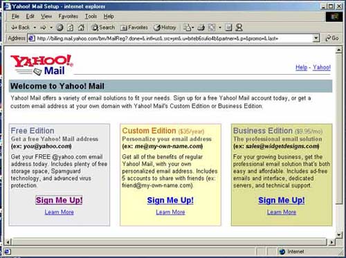 海外有大量的免费电子邮件服务,搜索一下“free email”就可以找到许多。台湾的电子邮件服务是一种方式,海外也有一些有中文的电子邮件服务。但是需要提醒您的是,yahoo.com.cn的服务器在中国,服务也是遵守中国的有关法律的……。而yahoo.com,hotmail.com,msn.com,mail.com,usa.com,email.com,等,由于与中国有合作关系,所以大法弟子不要用。海外华人背景的服务也要小心。如果您是敏感人物,至少要采用不断换地址的办法。这里仅以mail.yahoo.com为例(请不要用Yahoo的邮箱),为您介绍一下如何在英文网站上申请电子邮件帐号。