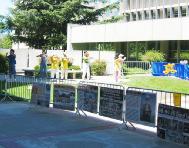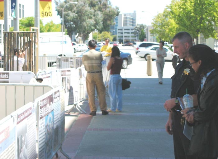 ![]() 警察在观看图片展板 | ![]() 记者在采访 | ![]() 法轮功学员在炼功 |