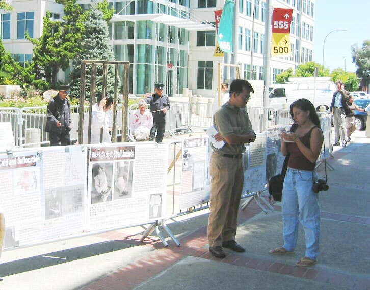 法轮功自1992年5月由李洪志师父传出,由于对身心健康的明显功效,在短短几年间就迅速传遍神州大地。至1999年有上亿的人在中国大陆修炼法轮功。但是江泽民出于个人极度的妒嫉,于99年7月20日它不顾其他中央领导人的反对,执意发动了对法轮功的迫害。据明慧网报道,至今至少有1020位法轮功学员被迫害致死。当天,学员向路人展示了在大陆法轮功学员遭受到的部份酷刑,其中有坐老虎凳、吊打、竹签扎手指、关铁笼子、和被强迫劳工。
