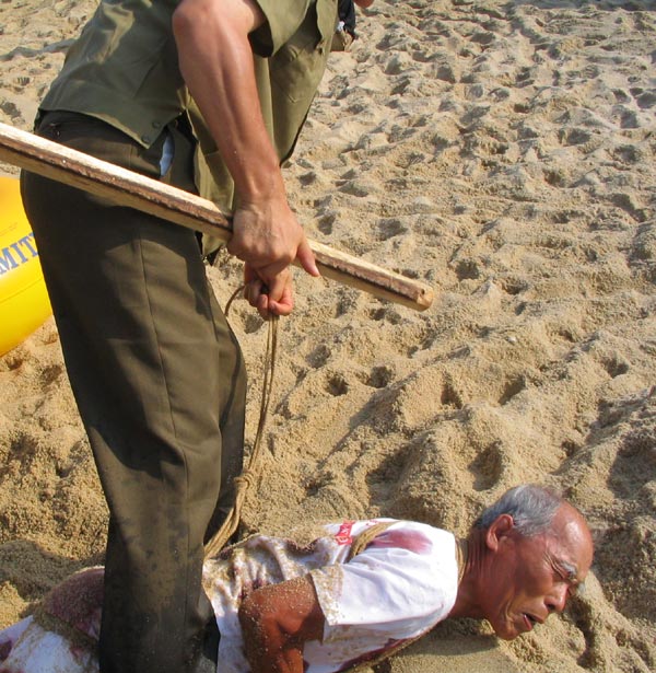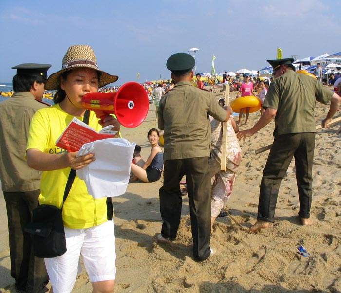 为了让更多的游客了解真象,在搞酷刑演示时,学员们放弃使用固定场地,而边走边做酷刑演示,边用高音喇叭解说,收到了很好的讲真象的效果。很多游客看到酷刑演示后疑惑的问:“这是真的吗?怎么这么残酷?”特别是当看到一位老人遭受迫害的酷刑演示后,很多善良的游客不忍心看到这种场景,纷纷前来制止,并且生气的表示:“你们怎么这样对待老人?!”当学员们讲清真象后,当游客们知道中国还有千千万万的法轮功学员不分男女老幼的在遭受着这类酷刑折磨后,深受震撼,纷纷谴责中国江氏集团的残暴行为。