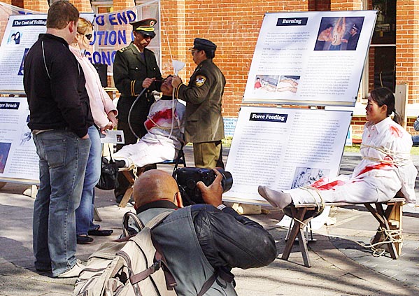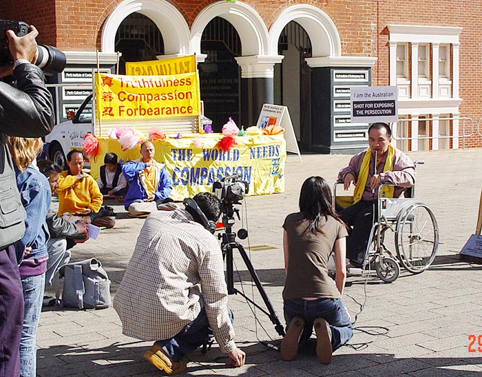 2004年8月28日和8月29日,在西澳省会柏斯市中心的心脏地带--柏斯文化中心(Perth Culture Centre)与西澳省立图书馆交汇处,一场令人触目惊心的法轮功真人酷刑展与另一组身着黄衣服优雅舒缓的炼功情景吸引了众多的路人。凝重的音乐声、惨烈的景象与学员们祥和炼功的画面形成了鲜明的对比,而法轮功学员所展示出来的面对5年来的魔难始终坚贞不屈的精神,使路人震惊和感动。人们纷纷接过传单,在反迫害的签名表上签名并询问如何能更有效的帮助法轮功学员。许多来自大陆的华人也纷纷驻足观望、思索询问。西澳最大的报纸The West Australian、ABC澳洲广播电台、Murdoch大学广播传媒、本地自由记者、摄影师等以及华人传媒新!唐!人:电视台、大.纪.元;时报等均到场采访并摄下大量镜头。