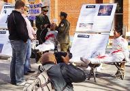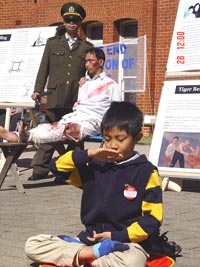 “许多人是流着泪看我们的展示的,”一位展示被强行灌食情景的女法轮功学员说,“也有许多人强忍着泪看完展板,然后在反迫害的呼吁信签下自己的名字,还有人直到离去很远,还一再回头看我们。”她说,“还有孩子问我,奶奶,这一切都是真的吗?我告诉他们,我们今天展示的只是冰山一角,在大陆真实发生的一切比这还要残酷千万倍,而且直到此刻仍在发生。”这位女学员曾经在大陆因去北京上访被抓,在拘留所因绝食而被强行灌食。“一个50多岁的老太太被强行脱光衣服在人前走,被几个五大三粗的人强行按着手脚、用又粗又硬的橡皮管硬塞進鼻孔里灌食……那种情景,你们能想象得到吗?”
