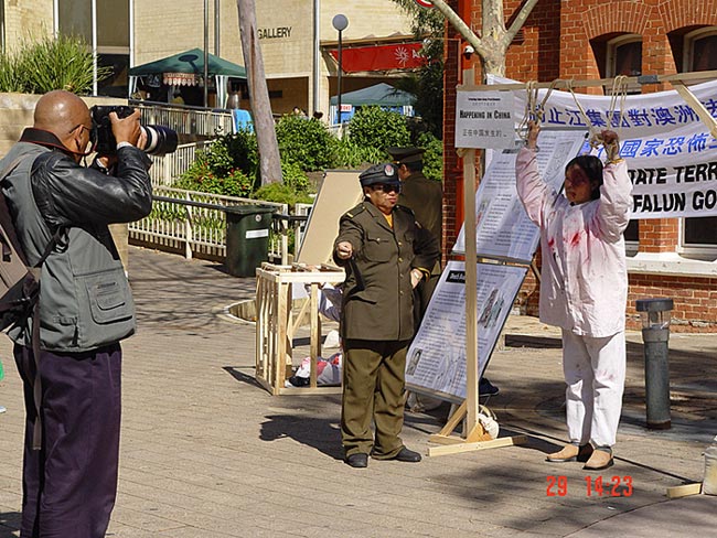 “这是西澳省首次举办这样大型的、反映法轮功学员在大陆遭受酷刑迫害真实情况的真人展出,”本次活动主办人、柏斯一家购物中心意大利速食店的老板陈先生表示,“悉尼、墨尔本、南澳等地许多法轮功学员为了支援这一活动,牺牲了周末时间,不远千里自己掏钱、义务远道飞来,而本地的法轮功学员更是用了数月的业余时间,根据曾经遭受迫害的学员们的描述,自己掏钱买材料,亲手将这些道具、展板一件一件的做出来。知道真象是每一个人的权利。我们希望我们的行动,能帮助更多人了解法轮功真象,帮助早日停止在中国大陆发生的这场惨绝人寰的迫害。 ”