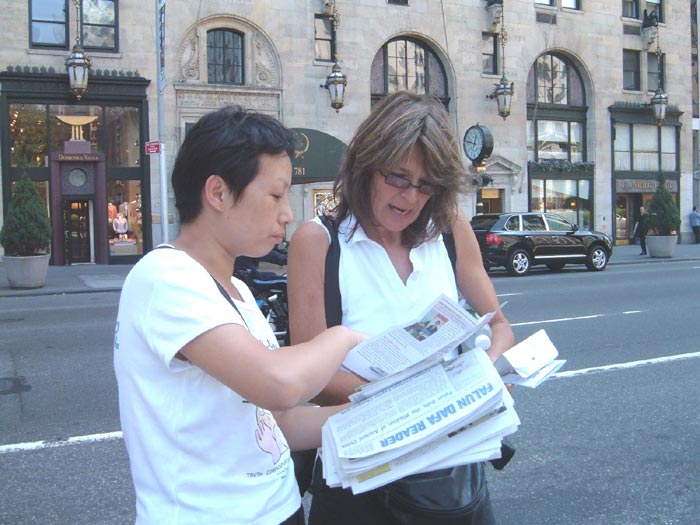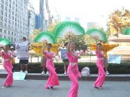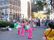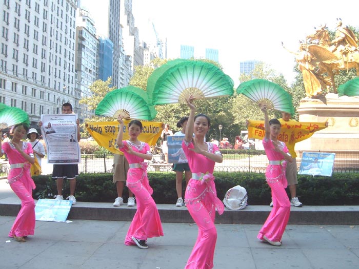 2004年8月29日星期天,盛夏八月的纽约中央公园人潮熙攘。休闲的人们和冲着美国共和党代表大会而来的人们混杂在一起,很是热闹。在公园的东南角進行的我们的街头表演吸引了大批的人们驻足观看。这是一群穿着鲜艳服饰的女学员们在中国传统音乐声中翩翩起舞,吸引着大批行人。她们时而表演扇子舞、傣族舞,还有法轮功的五套功法演示,以及黄土高原风格的腰鼓表演。看到此景的其他地区的学员也纷纷加入到了表演和派发材料的行列。