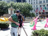 ![]() 中国传统扇子舞在纽约中央公园 | ![]() 《纽约时报》记者采访参与者 | ![]() 法轮功五套功法演示 |