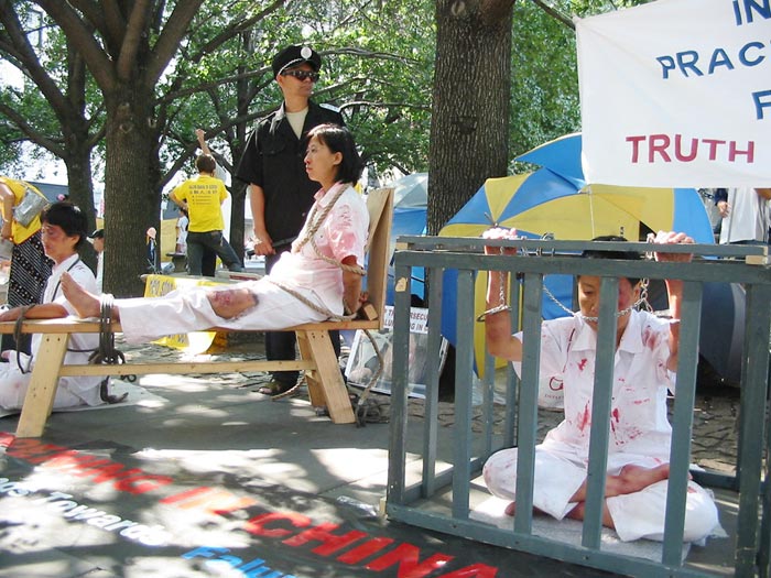 街边的右面是演示法轮功学员正在中国遭到酷刑迫害的情况,左面则是他们为路人演示法轮功的五套功法。一边惨不忍睹,另一边宁静祥和,两幅画面形成了鲜明的对比。一张小桌子上摆放着一些资料、签名本,还有就是在桌面上静静开放着的这些多彩的莲花。
