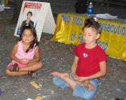 另一个妈妈带着四个小女孩,其中三个是她的女儿,肚子里还有一个小宝宝。她那三个活泼可爱的女儿学着法轮功学员的样子在那里盘起腿来。