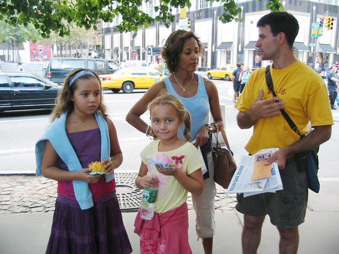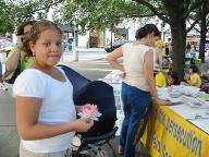 一位推着儿童小车的年轻女性走过来,她站在展板前静静的看了起来。过了一会儿,一个身穿黄色T恤衫的小伙子与她交谈了起来。小伙子向她介绍了什么是法轮功,法轮功在中国遭到的迫害等等。之后,她在“停止迫害”的签名本上写上了自己的名字。这时,另一个法轮功学员将一朵淡黄色的莲花送给了童车中的小婴孩,小婴孩卷卷的头发,瞪着一双大大的眼睛,兴奋的接过了莲花。