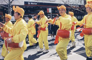 中午12点时,迎春游行开始了,当法轮功学员的队伍出现时,主持人说:“这是法轮功学员,他们的信仰是‘真、善、忍’。”