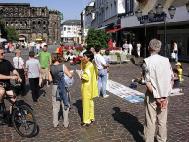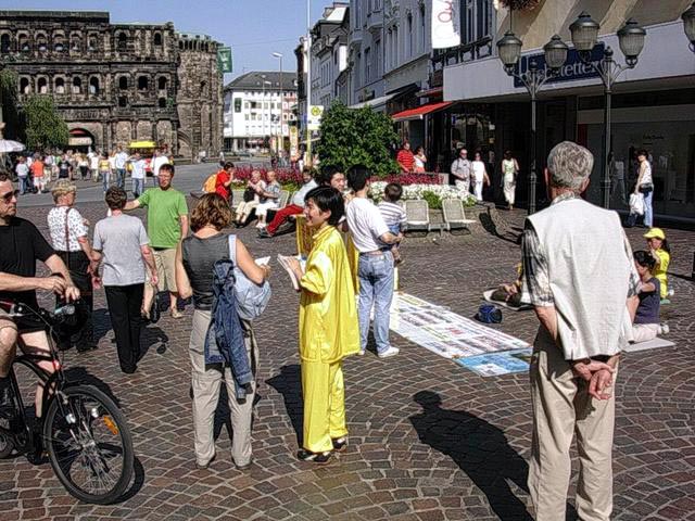 2004年9月4日,周边地区的法轮功学员来到在特里尔,在古罗马时期的城门(Porta Nigra) 举办首次法轮大法信息日。