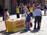 一对来自汉堡的老年夫妇在图片展前停下来,非常仔细的阅读图片说明,并对法轮功学员说,他们曾去过中国,感触良深。中国的经济比以前发展了很多,中国的城市越来越现代化了。站在汉堡的港口,举目一望,到处都有中国的集装箱,然而江氏政体对于中国人的基本权利与信仰自由的钳制仍是很可怕的,她说,她现在正在读关于中国文化大革命的书籍,她为丑恶的政治施与人们精神与心理上的负担而感到难过。同时,她也为真善忍的精神及法轮大法弟子们的举动而感动。她动情的说,你们是高贵的人。