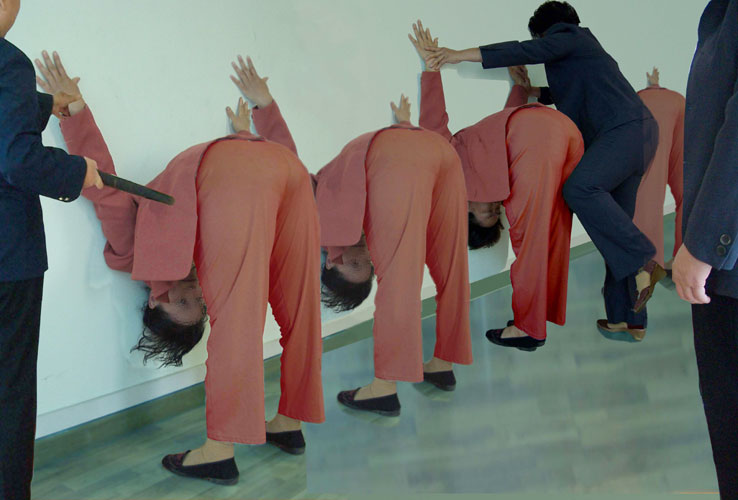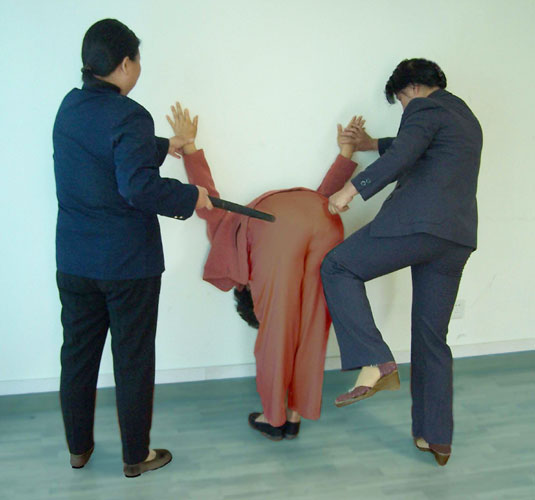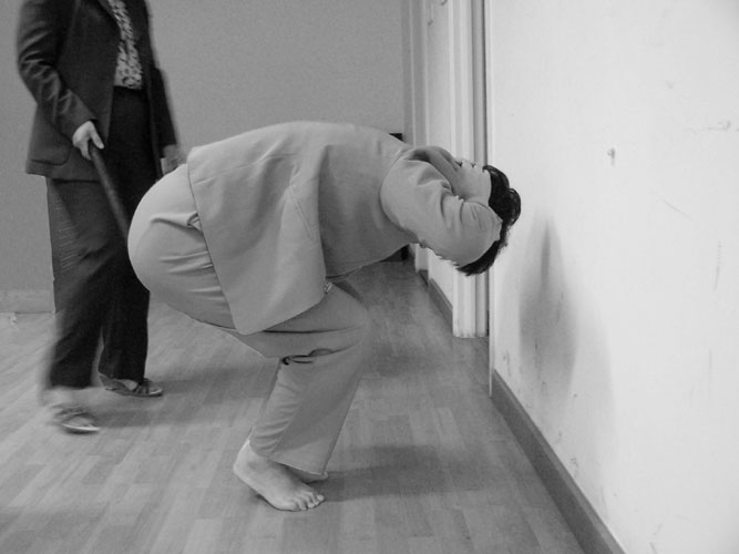 拒绝写保证书或穿劳教服的法轮功学员被用这种方式体罚,美其名曰“练规范”,不做的人就要被送進没人的房间受到更严重的迫害。