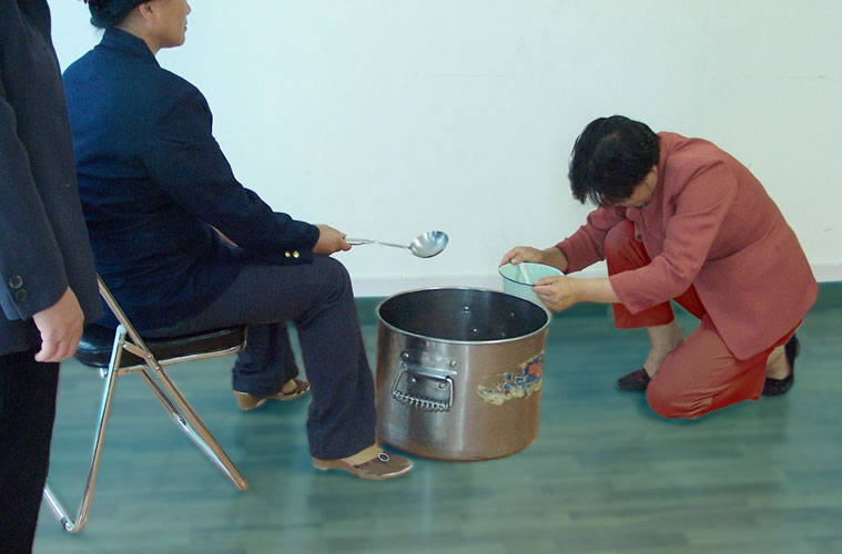 要求所有被劳教的人(其中多数都是法轮功学员),每天三次打饭时必须单腿跪下向警察乞讨,后来在一批又一批法轮功学员的抵制下改成鞠躬90度,同时说:“X大队X班劳教人员XXX请求打饭。”