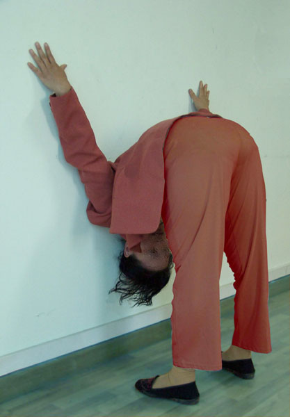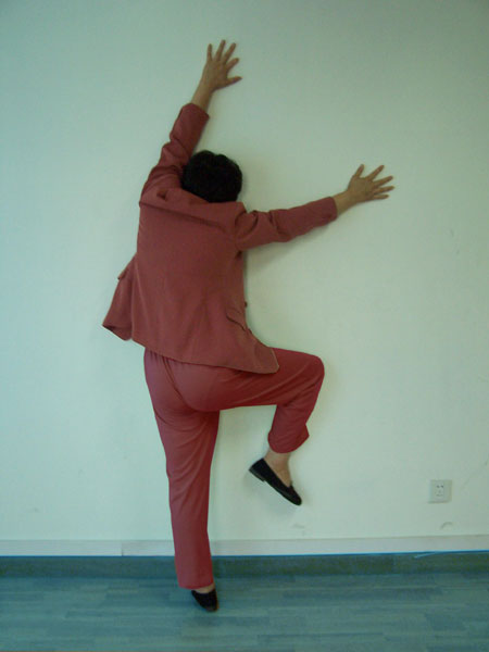 一条腿抬起,一条腿站立,上身贴墙,双臂向抬腿的一侧斜伸,身体重心很不平衡,还要求上身保持正直。