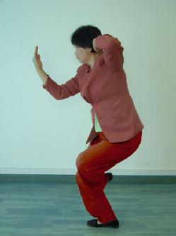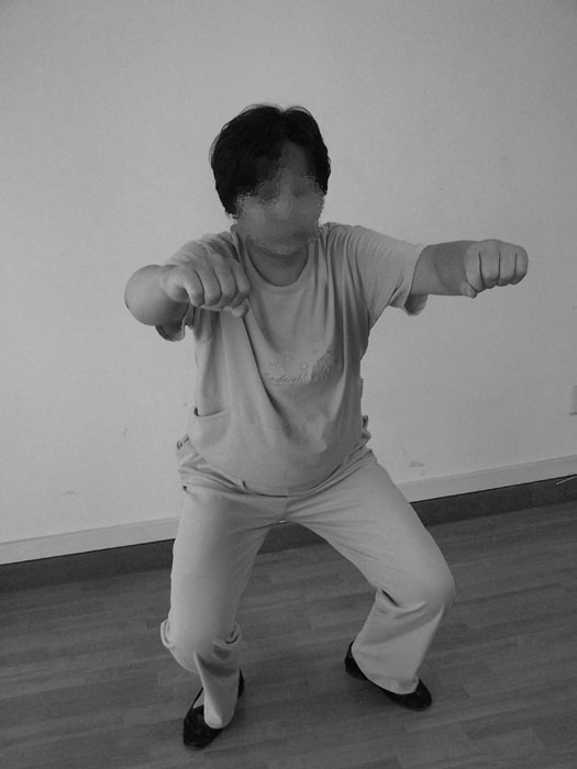 类似武术的骑马蹲裆式。经过各种折磨,几个月后再不接受洗脑的法轮功学员就要被送進集训队。在集训队里除了有电刑、笼子等刑罚外,也经常用体罚的方式進行长期迫害。“骑摩托”是集训队里常用的一种。双腿弯曲站立,双臂握拳平伸,让人四肢同时受苦。