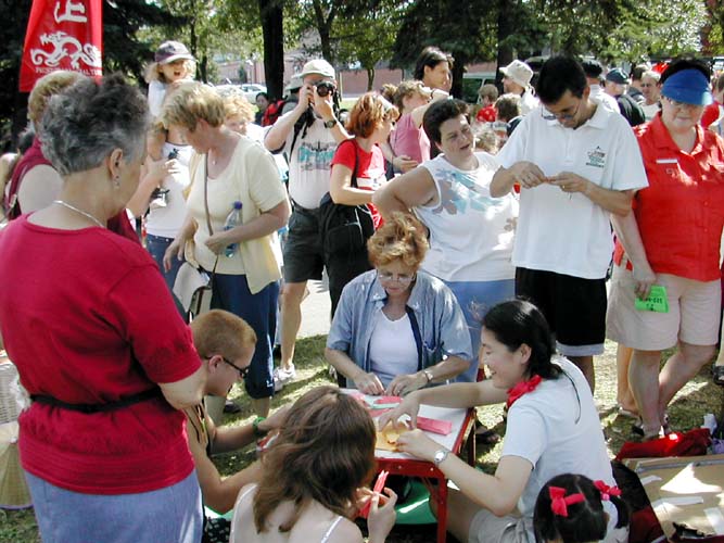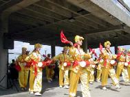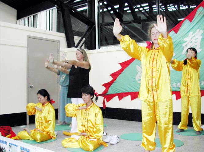 ![]() 腰鼓表演 | ![]() 功法表演 | ![]() 人们向法轮功学员了解真象,学折莲花 |