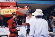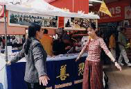 一位年轻的中国学生主动走到摊位前索取真象资料。在听完了学员向他介绍的迫害真象后,他问:“我能做什么?”学员告诉他,可以把这些事实告诉他的亲朋好友,于是他又拿了一份资料。