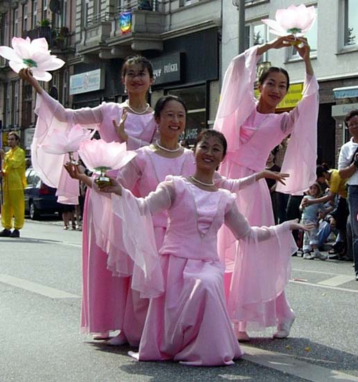 【明慧网2004年9月14日】2004年9月11日,来自82个不同民族的近2000人在德国汉堡市展示了各民族的文化。法轮功学员今年再次应邀参加汉堡一年一度的文化节,他们以出色的腰鼓表演、莲花舞和别具一格的花车为汉堡市民带来了法轮大法的美好,并展现了中华民族传统的文化精髓,赢得了汉堡市民的阵阵掌声。法轮功学员的演出荣获第三名,被授予荣誉证书和奖金。
