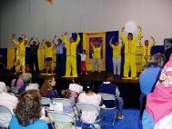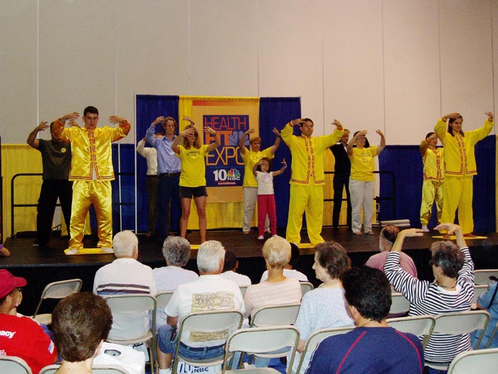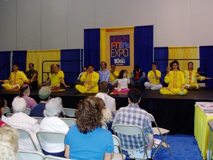 下午3:30,舞台上身着传统炼功服及便服的法轮功学员开始了功法演示。整个大厅回荡着炼功音乐及学员的男中音解说,那解说似在讲述着一部历史:大法洪传,得者喜之,遭遇巨难,坚韧不拔。