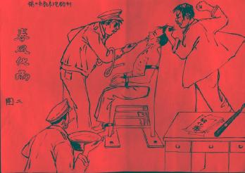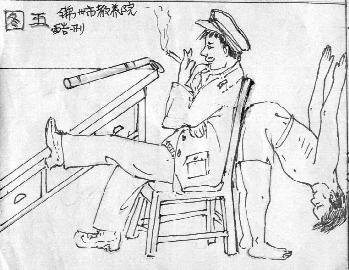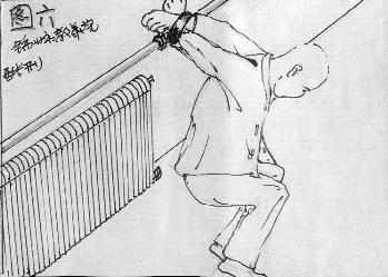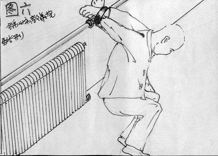 将人双手背扣在暖气管上,使人半蹲不蹲,长期站不直,蹲不下,吃饭用人喂。(见图六)