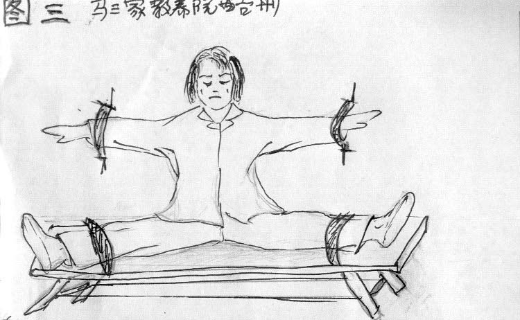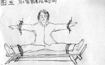 将人双手固定在墙上,双腿固定在凳子上,成“土”字形。(见图三)
