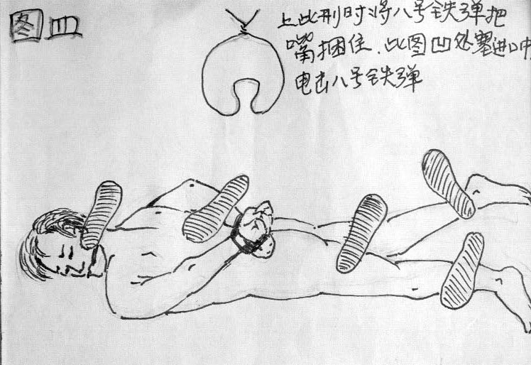 把人剥光衣服,趴在地上,双手被扣。三个警察分别踩在头上、后背及大腿上,另一警察双脚踩在两脚腕上,用全身重量将脚踩开,用“8号铁弹”塞進口中,并在后脑后固定(如示意图)。踩头部的警察用高压电棍电“8号铁弹”及脸部和五官,踩后背的警察电上身,踩腿的警察电下身及阴部,踩脚腕的警察电脚心及膝盖窝。(见图四)