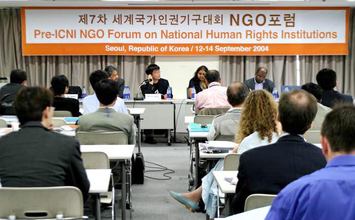 上午是主题发言(主题:1. 纷争及对付恐怖主义过程中的人权保护;2. NGO与国家人权机构的战略性合作关系),下午進行了分组讨论。韩国法轮功学员们分别参加了4个小组的讨论,将法轮功无辜受迫害的真象转达给了各国的NGO代表们。