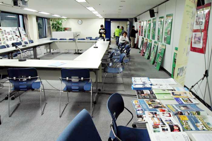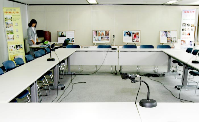 | 第7届世界人权机构大会NGO研讨会主题发表会场 | 摆放在人权委员会展示厅的法轮大法真象资料和迫害真象图片 | |