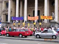 在这之前,学员们進行了充分的准备工作。下午,位于市中心的证券交易所前,一边是学员们祥和的炼功,另一边是学员们真人模拟的酷刑,有老虎凳,竹签扎指,囚笼等,并配以图片文字说明。来往的行人一下子被吸引过来,纷纷驻足。人们被眼前的这一幕震惊了。 非常多的人都无法相信当今世上还有这样的暴行发生。很多过往车辆的司机也纷纷索要资料。