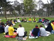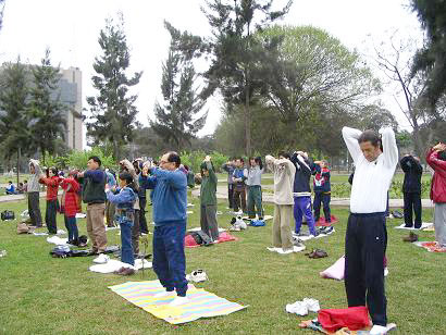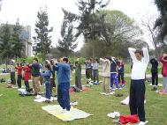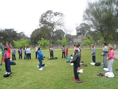周末炼功点上集体炼功学法同天下午两点和三点,蔡医生主持的另外两家电台RADIO CORA和RADIO LATINA再次响起了学员们真诚的声音:“今天法轮功的学员们很幸运地生活在秘鲁这个自由的国家里,他们可以在绿色的草坪上打坐炼功,拥有内心的祥和与宁静,可是在中国大陆,却有亿万的兄弟姐妹,仅仅因为坚持他们的信仰,被迫失去工作,失去家庭,甚至失去宝贵的生命,请将法轮大法以及这一功法遭到的严酷迫害告诉您的亲朋好友,这就是对法轮功学员的最大的支持。”