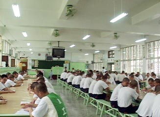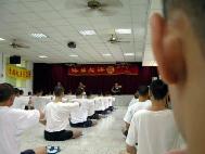 ![]() 受刑人一起学法 | ![]() 台下的学生聆听研习心得发表 | ![]() 监狱青年齐炼神通加持法 |