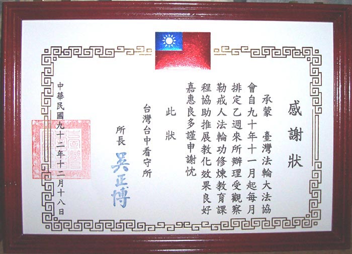 2003年12月20日,台湾法轮大法学会接受台湾台中看守所颁发感谢状。