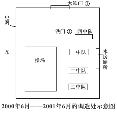 (背景介绍:北京市劳教人员调遣处是将从看守所被判处劳教的人员(包括法轮功学员和普通劳教人员)集中临时关押,长则两个月,短则半个月,进行丧失人性的“入所规范教育”。然后,男性转到团河劳教所,女性转到天堂河劳教所。调遣处始建于2000年6月,当时有四个中队(四排破平房),每中队四个班,每班约30余人。四中队为女队,一、二、三中队为男队,高墙上全为电网。2001年夏,在操场上又建了三排平房,关押学员。2001年12月调遣处迁址,入住新楼)