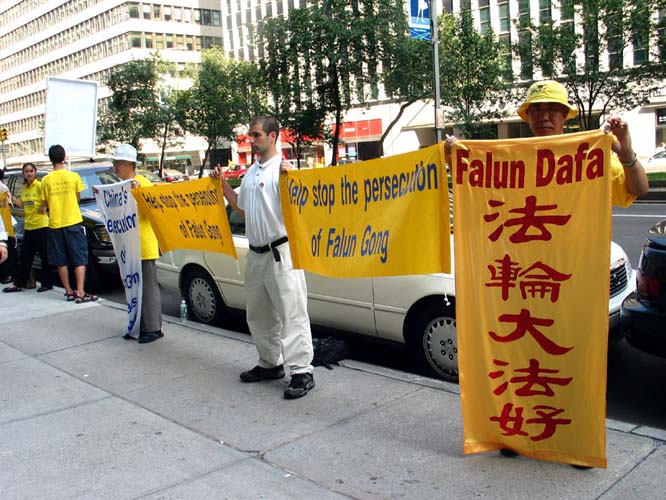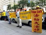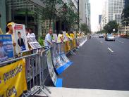 从凉爽的多伦多来到闷热难当的纽约,他们顾不上歇息,迅速来到著名的华尔道夫酒店对面沿街排开,用人墙组成“勇气长城”。他们举起了一幅幅体现法轮大法美好的炼功图片,摆开了中国恶警残酷折磨法轮功学员的酷刑图片及文字说明,拉开了一幅幅呼吁世界上的善良人民帮助停止这场镇压的标语。在毒热的日头下,他们庄严、肃穆的神情和大法纯正的能量场,震撼了不少纽约人和游客。行人、出租车司机接过了资料;旅游车司机接过资料发给游客们;高级轿车的人放下车窗接过资料;观看反酷刑展的行人流下了热泪;保安和警察们接过了资料,法轮功学员的理性与和平得到他们的赞扬。