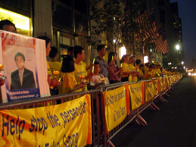 入夜,多伦多学员与纽约学员们,在几个著名景点和华尔道夫酒店对面举行了烛光悼念,悼念为了坚持信仰而献出生命的中国大陆同修们。一朵朵莲花灯灯光闪烁,有几个同修轻声唱起了“法轮大法好”,渐渐的,越来越多的同修加入了合唱:“法轮大法好,法轮大法好,法轮大法是正法,佛光普照……”清亮的歌声穿越了曼哈顿的夜空,表达了法轮功学员们对大法的坚定不移的信仰,表达了他们对为真理而献身的大陆同修们的最崇高的敬意!