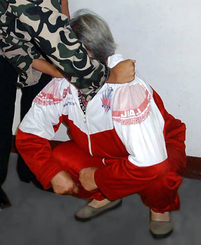 图1-1:马三家教养院队长黄海燕打法轮功学员石胜英10多个耳光,石胜英的脸被黄海燕的指甲划破,眼里也充了血。黄海燕又向下按石胜英的两肩呈蹲下姿势。