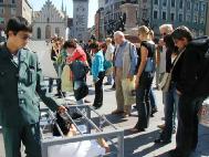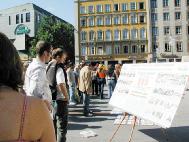 人们对法轮大法的渴望激励着大家,扮演受酷刑者和警察的学员在骄阳下曝晒几个小时,他们都默默坚持下来,许多学员顾不上吃饭喝水,就想将法轮大法的真象多告诉一个人。一位年轻的中国学生,刚开始看到酷刑展时非常生气,直对着学员叫嚷,说是丢中国人的脸等等。学员十分耐心的告诉他事情的真象,从天安门自焚真象、到底什么是真正为一个国家好、江氏集团对法轮功学员犯下的群体灭绝罪到法轮功的和平抗争。最后,那位青年安静了下来,并带走了真象光盘和资料,他答应回家好好看看。