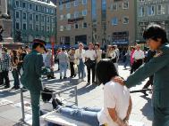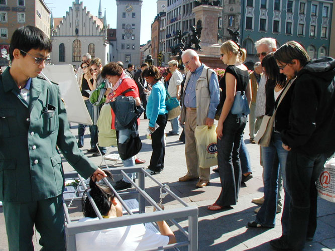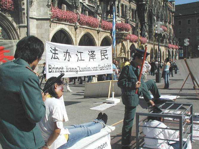 在展台的一侧,优美的音乐、舒展的炼功动作和介绍法轮大法洪传世界的展板吸引着人们的目光,人们驻足观看,欣然接过学员们递上的资料。在展台的另一面,老虎凳上被捆绑的和被关押在笼子里的法轮功学员,面露凶像的警察,演示出中国劳教所中鲜为人知、令人发指的一幕,人们面对惨烈的场景,被震惊了。许多人瞪大眼睛专注的望着,不敢相信眼前的一幕每天都在中国发生着。而当他们被告知这里展示的只不过是冰山一角,在中国实际的镇压比这不知要残酷多少倍时,人们被震怒了,纷纷在把江××送上审判台的签名簿上签名。