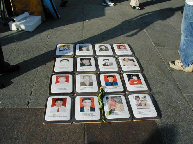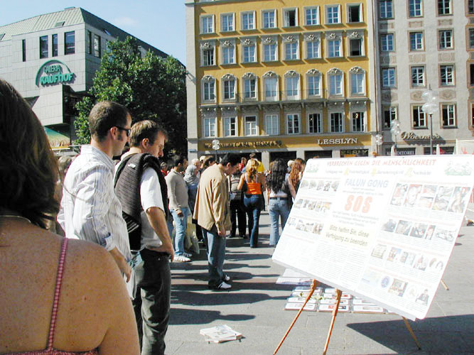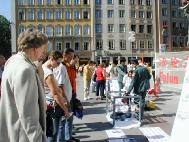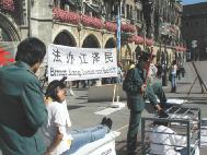 有两位德国人看到展板的第一眼时说,哦,是法轮功×教,被一位法轮功学员听到了,她告诉他们,请不要相信江氏集团的谣言,法轮功到底是什么,为什么在中国会受到镇压。他们这才恍然大悟,明白了真象后马上主动到展台上去签名要求公审江××。